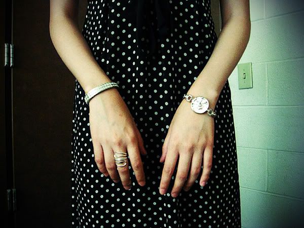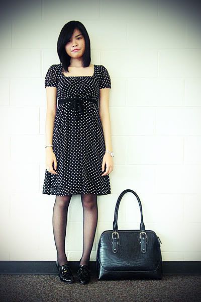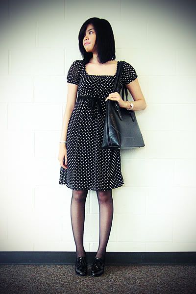 Merona dress and bag, Hanes tights, thrifted shoes, City walk faux watch bracelet, thrifted studded bracelet Charlotte Russe ring